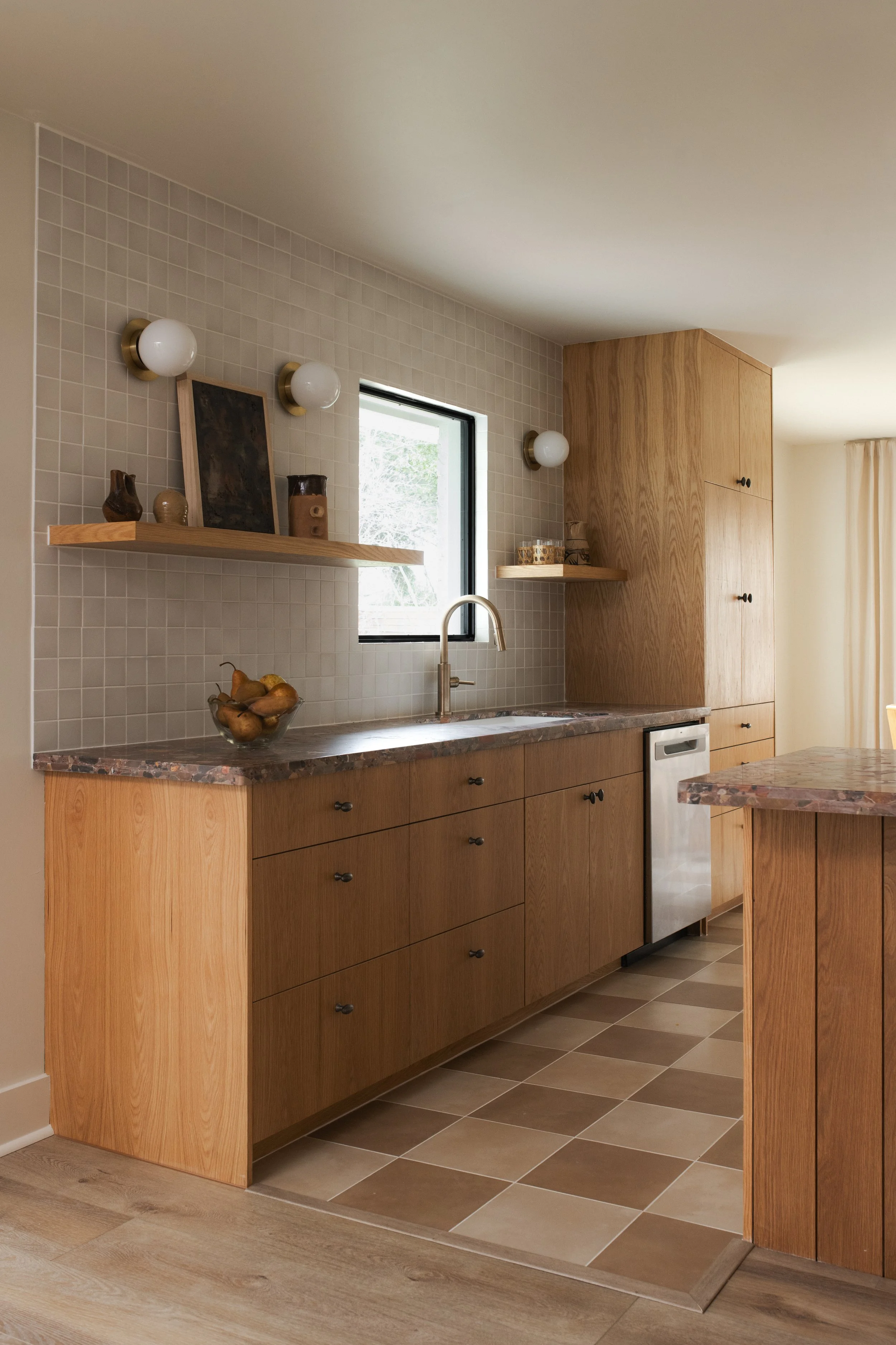 A full-scope remodel honoring mid-century character with custom white oak cabinetry, earthy tones, and architectural restraint rooted in timeless design.